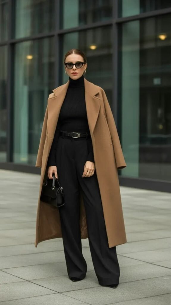 The contrast between black and camel creates a sharp, sophisticated edge. Add a structured black tote and gold jewelry to complete the look. This pairing proves that how to style camel coat outfits doesn’t have to be complicated — sometimes simplicity is the most elegant choice.