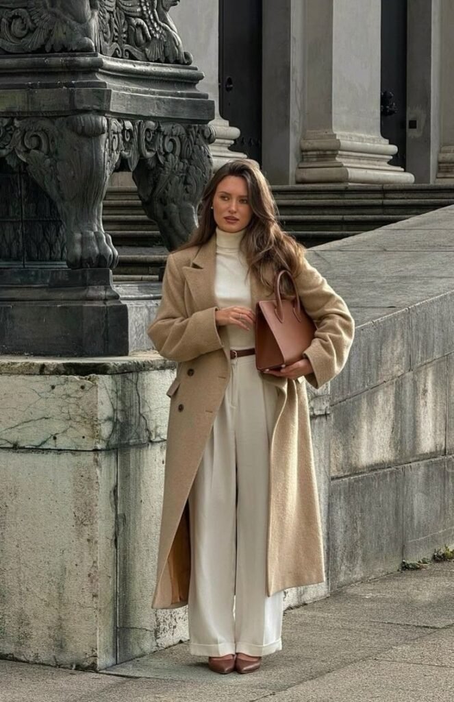 For balance, keep your top simple — a white turtleneck or black bodysuit works perfectly. Complete the look with ankle boots or heeled mules. For fashion lovers learning how to style camel coat looks that make a statement, this mix of textures is key.
