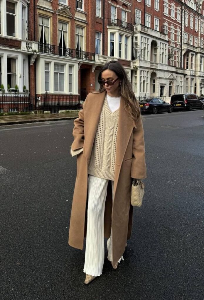 Winter whites look extra fresh when styled with camel outerwear. Pair wide-leg white trousers with a chunky cream or beige sweater for a soft, luminous effect.
